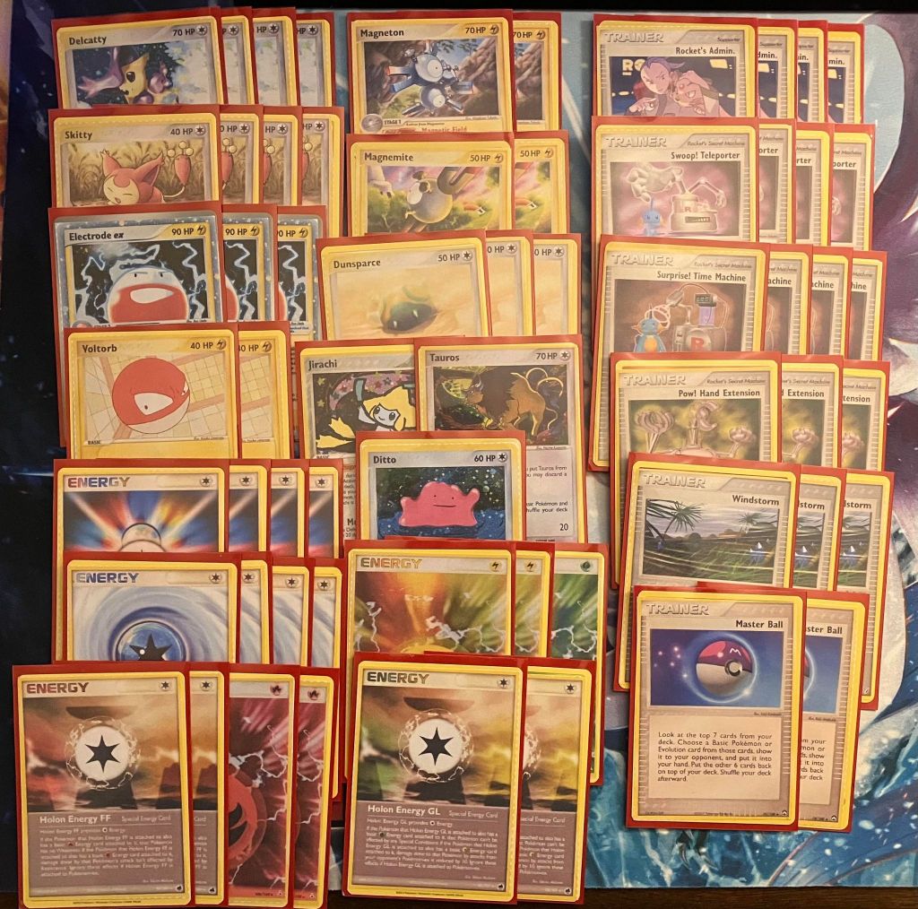 | 4 Delcatty 4 Skitty 3 Electrode ex 2 Voltorb 2 Magneton 2 Magnemite 3 Dunsparce 1 Jirachi 1 Tauros 1 Ditto | 4 Rocket’s Admin. 4 Swoop! Teleporter 4 Surprise! Time Machine 3 Pow! Hand Extension 3 Windstorm 2 Master Ball | 4 Scramble Energy 4 Cyclone Energy 2 Holon Energy FF 2 Fire Energy 2 Holon Energy GL 2 Lightning Energy 1 Grass Energy |