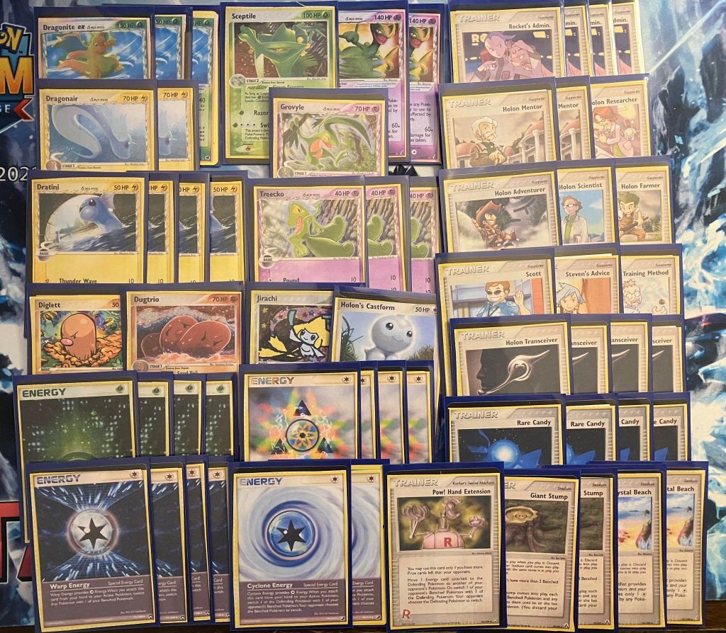 | 3 Dragonite ex 2 Dragonair 4 Dratini 2 Sceptile ex 1 Sceptile 1 Grovyle 3 Treecko 1 Dugtrio 1 Diglett 1 Jirachi 1 Holon’s Castform | 4 Rocket’s Admin. 2 Holon Mentor 1 Holon Researcher 1 Holon Adventurer 1 Holon Scientist 1 Holon Farmer 1 Scott 1 Steven’s Advice 1 Professor Elm’s Training Method 4 Holon Transceiver 4 Rare Candy 1 Pow! Hand Extension 2 Giant Stump 2 Crystal Beach | 4 Grass Energy 4 Delta Species Rainbow Energy 4 Warp Energy 2 Cyclone Energy |