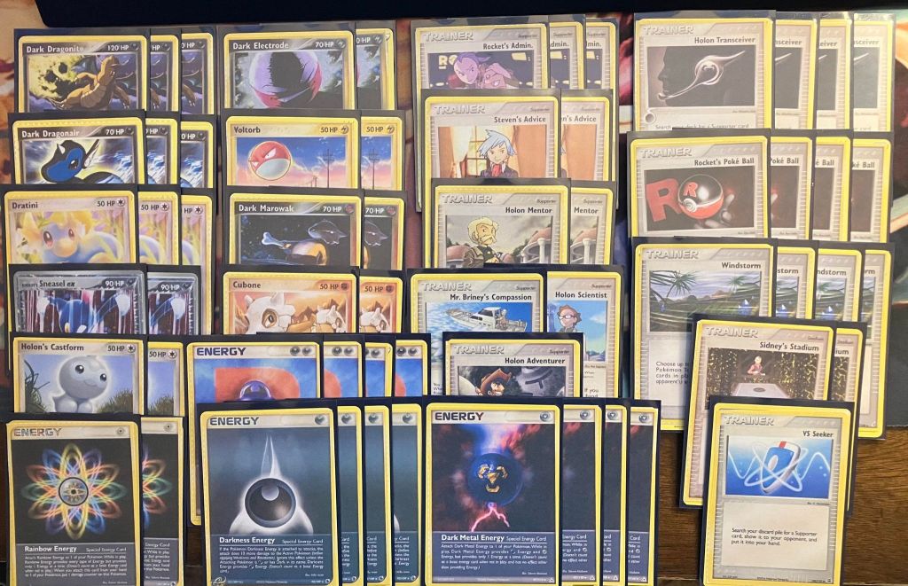 | 3 Dark Dragonite 3 Dark Dragonair 3 Dratini 2 Rocket’s Sneasel ex 2 Dark Electrode 2 Voltorb 2 Dark Marowak 2 Cubone 2 Holon’s Castform | 3 Rocket’s Admin. 2 Steven’s Advice 2 Holon Mentor 1 Holon Adventurer 1 Holon Scientist 1 Mr. Briney’s Compassion 2 Sidney’s Stadium 4 Holon Transceiver 4 Rocket’s Poke Ball 4 Windstorm 1 VS Seeker | 4 R Energy 4 Darkness Energy 4 Dark Metal Energy 2 Rainbow Energy |
