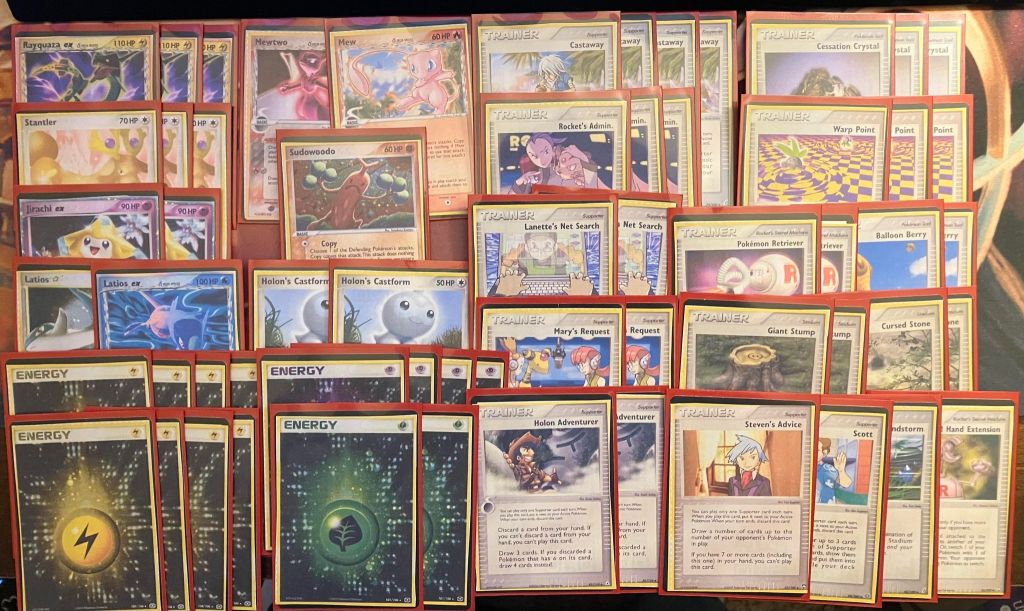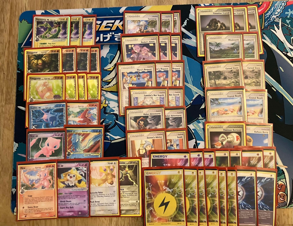 | 3 Rayquaza ex 4 Exeggutor 4 Exeggcute 1 Latios ex 1 Latias 1 Mew Star 1 Mew ex 1 Mew 1 Stantler 1 Jirachi ex 1 Holon’s Magnemite | 3 Rocket’s Admin. 3 Mary’s Request 3 Castaway 2 Lanette’s Net Search 2 Holon Adventurer 1 Steven’s Advice 1 Scott 3 Cessation Crystal 2 Cursed Stone 2 Crystal Beach 2 Windstorm 1 Pokemon Retriever 1 Balloon Berry | 6 Lightning Energy 3 Psychic Energy 2 Fighting Energy 2 Multi Energy 2 Warp Energy |