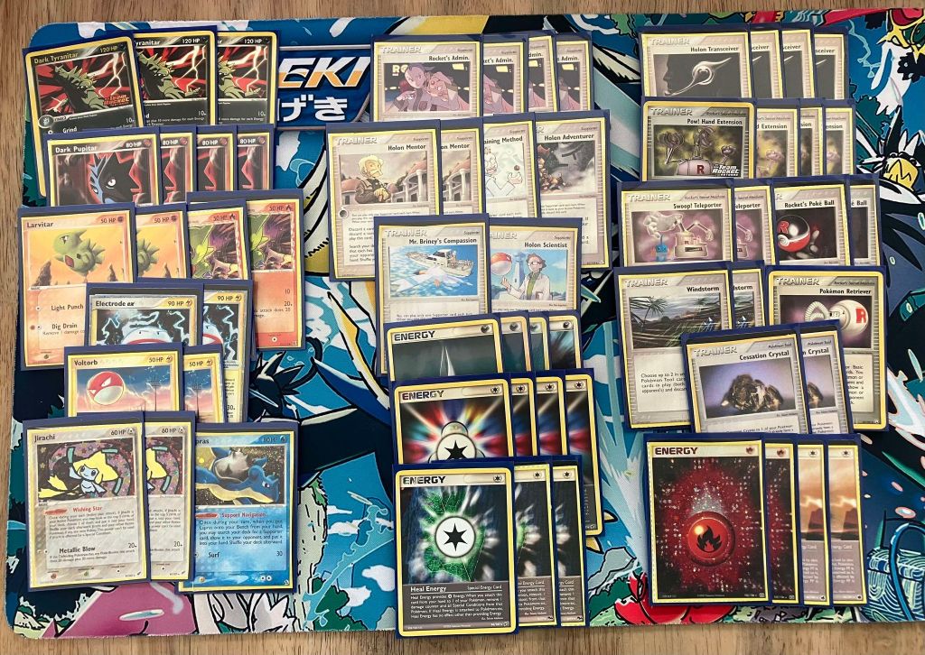 | 3 Dark Tyranitar (TRR 19) 4 Dark Pupitar (TRR 41) 2 Larvitar (TRR 63) 2 Larvitar (DS 73) 2 Electrode ex 2 Voltorb 2 Jirachi (DX 9) 1 Lapras | 4 Rocket’s Admin. 2 Holon Mentor 1 Holon Adventurer 1 Professor Elm’s Training Method 1 Holon Scientist 1 Mr. Briney’s Compassion 4 Holon Transceiver 4 Pow! Hand Extension 2 Swoop! Teleporter 2 Rocket’s Poke Ball 2 Windstorm 2 Cessation Crystal 1 Pokemon Retriever | 4 Darkness Energy 4 Scramble Energy 3 Heal Energy 2 Fire Energy 2 Holon Energy FF |