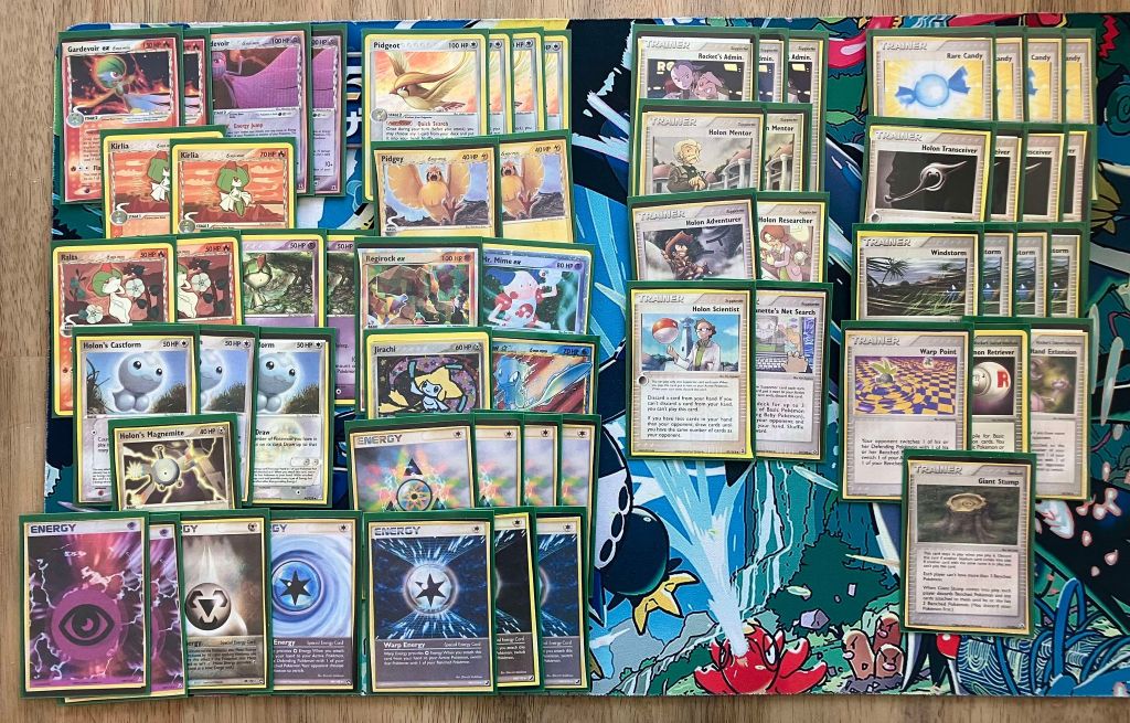 | 2 Gardevoir ex 2 Gardevoir 2 Kirlia 2 Ralts (DF 61) 2 Ralts (DF 60) 4 Pidgeot 2 Pidgey 1 Regirock ex 1 Mr. Mime ex (RG 110) 1 Jirachi (DX 9) 1 Mew Star 3 Holon’s Castform 1 Holon’s Magnemite | 3 Rocket’s Admin. 2 Holon Mentor 1 Holon Adventurer 1 Holon Researcher 1 Holon Scientist 1 Lanette’s Net Search 4 Rare Candy 4 Holon Transceiver 4 Windstorm 1 Warp Point 1 Pokemon Retriever 1 Pow! Hand Extension 1 Giant Stump | 4 Delta Rainbow Energy 3 Warp Energy 2 Psychic Energy 1 Metal Energy 1 Cyclone Energy |
