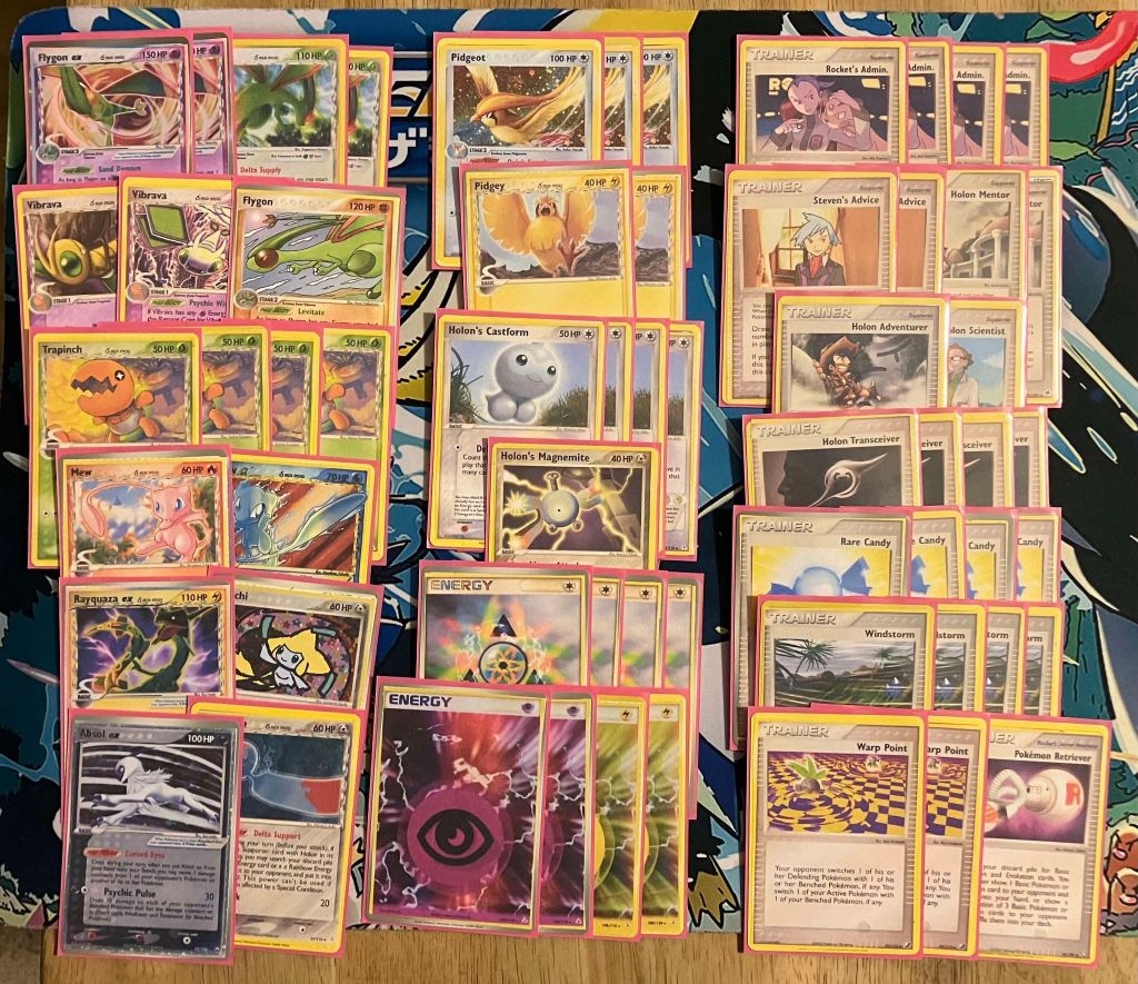| 2 Flygon ex (DF 92) 2 Flygon (HP 7) 1 Flygon (POP4 4) 1 Vibrava (DF 42) 1 Vibrava (DF 24) 4 Trapinch 3 Pidgeot 2 Pidgey 1 Mew 1 Mew Star 1 Rayquaza ex (DF 97) 1 Jirachi (DX 9) 1 Absol ex 1 Chimecho 4 Holon’s Castform 1 Holon’s Magnemite | 4 Rocket’s Admin. 2 Steven’s Advice 2 Holon Mentor 1 Holon Adventurer 1 Holon Scientist 4 Holon Transceiver 4 Rare Candy 4 Windstorm 2 Warp Point 1 Pokemon Retriever | 4 Delta Rainbow Energy 2 Psychic Energy 2 Lightning Energy |