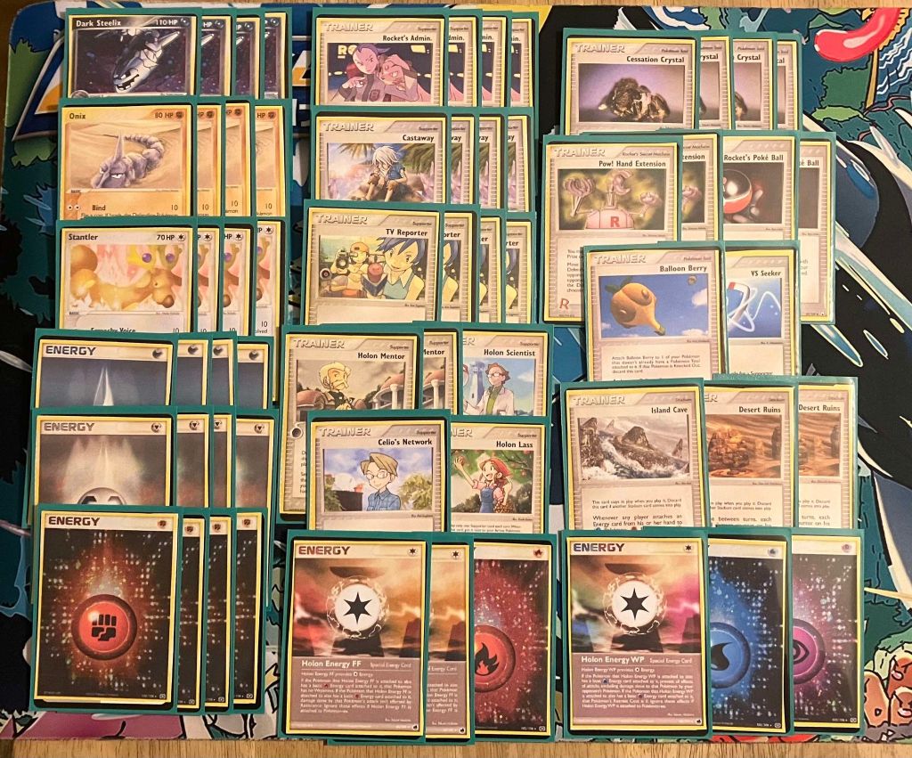 | 4 Dark Steelix 4 Onix 4 Stantler | 4 Rocket’s Admin. 4 Castaway 4 TV Reporter 2 Holon Mentor 1 Holon Scientist 1 Celio’s Network 1 Holon Lass 4 Cessation Crystal 2 Pow! Hand Extension 2 Rocket’s Poke Ball 1 Balloon Berry 1 VS Seeker 1 Island Cave 2 Desert Ruins | 4 Darkness Energy 4 Metal Energy 4 Fighting Energy 2 Holon Energy FF 1 Fire Energy 1 Holon Energy WP 1 Water Energy 1 Psychic Energy |
