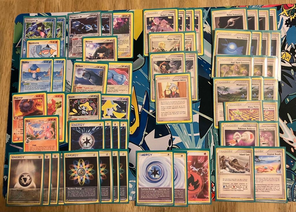 | 2 Swampert ex (CG 98) 1 Marshtomp 2 Mudkip 2 Metagross ex (PK 95) 1 Metagross (DS 11) 1 Metang 1 Beldum (HL 29) 1 Beldum (HL 28) 1 Magcargo 1 Slugma 1 Jirachi (DX 9) 1 Jirachi (HL 8) 1 Mew | 4 Rocket’s Admin. 2 Holon Mentor 2 Holon Adventurer 1 Steven’s Advice 4 Holon Transceiver 4 Rare Candy 3 Pow! Hand Extension 3 Windstorm 2 Warp Point 1 Pokemon Retriever 1 Swoop! Teleporter 1 Island Cave 1 Crystal Beach | 4 Metal Energy 4 Warp Energy 4 Rainbow Energy 2 Cyclone Energy 1 Fire Energy |