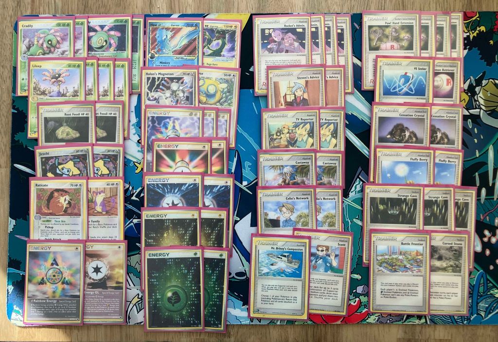 | 2 Cradily (SS 2) 2 Cradily (PK 7) 4 Lileep 2 Jirachi (DX 9) 1 Raticate 1 Rattata 1 Mew Star 1 Rayquaza ex 1 Dunsparce (LM 31) 1 Holon’s Magneton | 4 Rocket’s Admin. 2 Steven’s Advice 2 TV Reporter 2 Castaway 2 Celio’s Network 1 Mr. Briney’s Compassion 1 Scott 4 Pow! Hand Extension 1 VS Seeker 1 Pokemon Retriever 2 Cessation Crystal 2 Fluffy Berry 3 Strange Cave 1 Battle Frontier 1 Cursed Stone | 3 Double Rainbow Energy 2 Scramble Energy 2 Warp Energy 2 Lightning Energy 2 Grass Energy 1 Delta Rainbow Energy 1 Holon Energy GL |