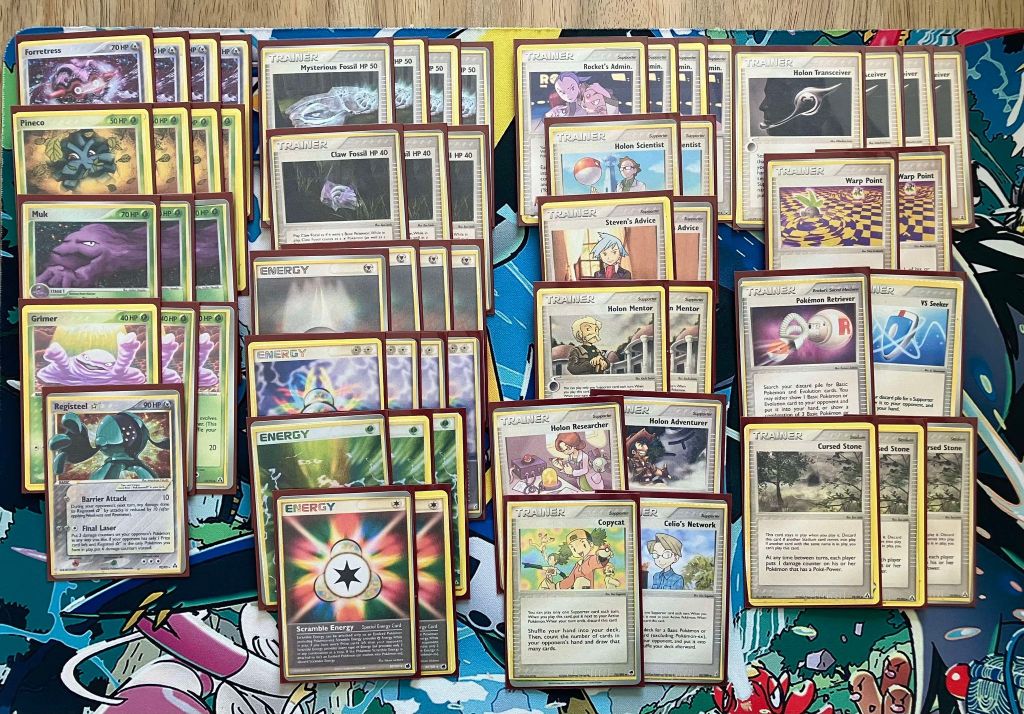 | 4 Forretress 4 Pineco 3 Muk 3 Grimer 1 Registeel Star | 4 Mysterious Fossil 3 Claw Fossil 4 Rocket’s Admin. 2 Holon Scientist 2 Steven’s Advice 2 Holon Mentor 1 Holon Researcher 1 Holon Adventurer 1 Copycat 1 Celio’s Network 4 Holon Transceiver 2 Warp Point 1 Pokemon Retriever 1 VS Seeker 3 Cursed Stone | 4 Metal Energy 4 Double Rainbow Energy 3 Grass Energy 2 Scramble Energy |
