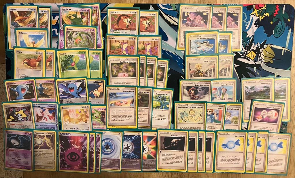 | 2 Pidgeot 1 Pidgeotto 2 Pidgey 2 Sceptile ex 1 Grovyle 2 Treecko 2 Raticate 2 Rattata 1 Wynaut 1 Wobbuffet 1 Rocket’s Wobbuffet 1 Murkrow 1 Jirachi (DX 9) 1 Mr. Mime ex (RG 111) 1 Stantler 1 Espeon Star 1 Unown (E) 1 Holon’s Magnemite | 3 Rocket’s Admin. 2 Mr. Briney’s Compassion 2 Holon Mentor 1 Holon Adventurer 1 Holon Scientist 1 Professor Elm’s Training Method 1 Scott 1 Celio’s Network 4 Holon Transceiver 4 Rare Candy 4 Pow! Hand Extension 2 Windstorm 1 Pokemon Retriever 1 Team Aqua Hideout 1 Crystal Beach 1 Giant Stump | 3 Psychic Energy 1 Warp Energy 1 Cyclone Energy 1 Scramble Energy |