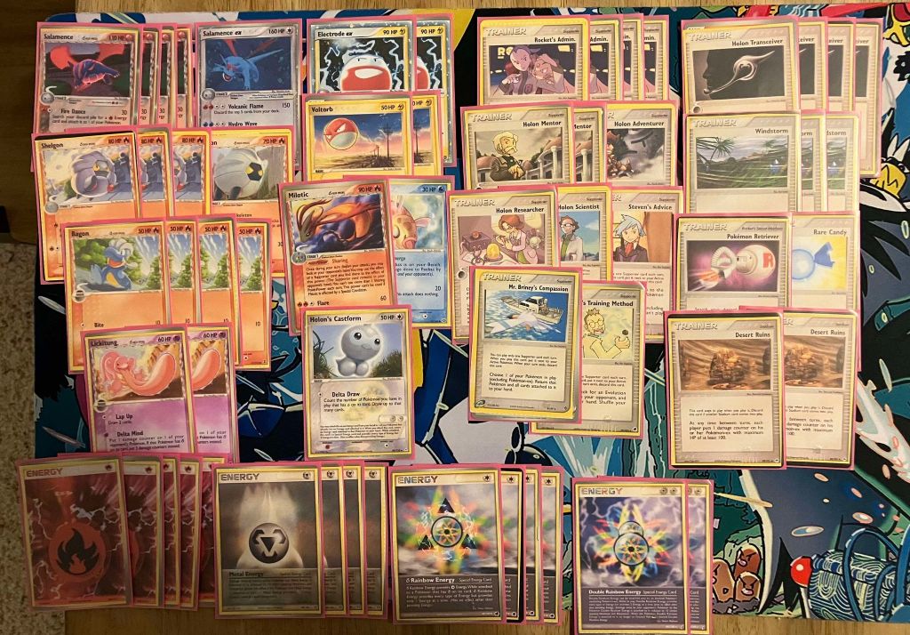 | 4 Salamence 1 Salamence ex (PK 96) 3 Shellgon (DS 53) 1 Shelgon (DS 54) 4 Bagon 2 Lickitung 2 Electrode ex 2 Voltorb 1 Milotic 1 Feebas 1 Holon’s Castform | 4 Rocket’s Admin. 2 Holon Mentor 1 Holon Adventurer 1 Holon Researcher 1 Holon Scientist 1 Steven’s Advice 1 Mr. Briney’s Compassion 1 Professor Elm’s Training Method 4 Holon Transceiver 3 Windstorm 1 Pokemon Retriever 1 Rare Candy 2 Desert Ruins | 5 Fire Energy 4 Metal Energy 4 Delta Rainbow Energy 2 Double Rainbow Energy |